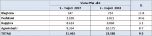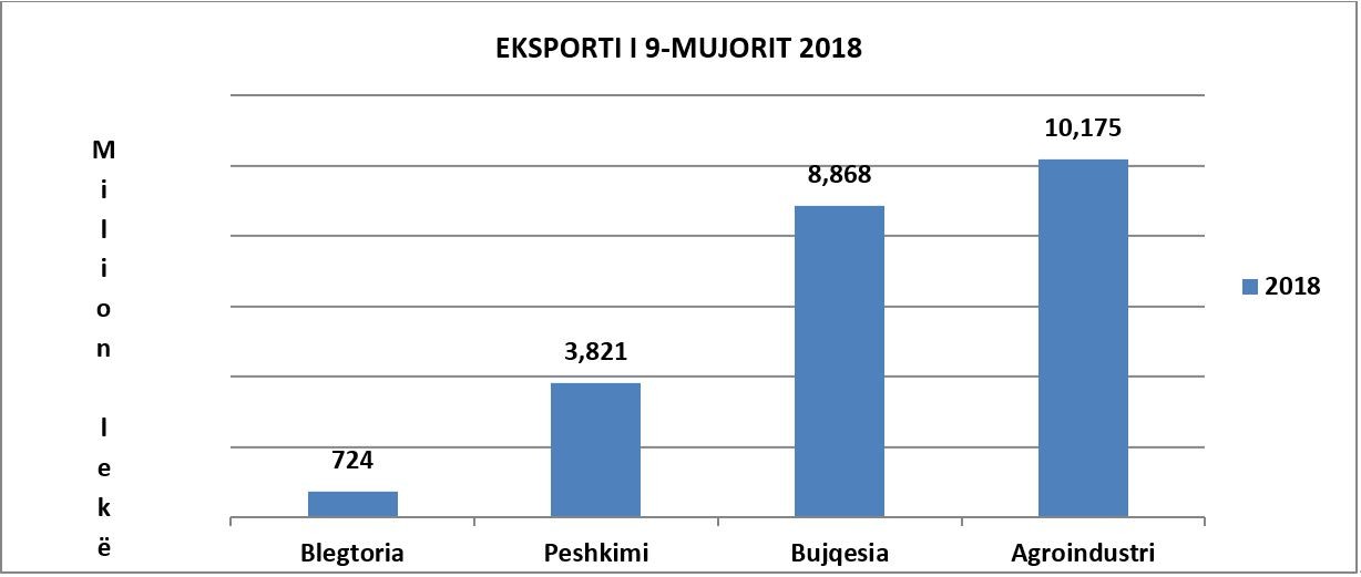 Sipas të dhënave zyrtare eksportet bujqësore për 9-mujorin 2018 kanë shënuar një rritje prej 9.9% krahasuar me të njëjtën periudhë të vitit të kaluar. Të dhënat tregojnë që për 9-mujorin e parë të 2018, të gjithë kapitujt kanë rezultuar me rritje. Rritjen më të madhe e ka sektori i peshkimit me 34.6%, blegtoria me 11.8%, agroindustria me 8.7% e ndjekur më pas nga bujqësia me 3 %. Në zërin bujqësia, e cila megjithëse renditet e fundit, vëmë re se disa nga artikujt e saj kanë shënuar rritje të ndjeshme krahasuar me 9 – mujorin e 2017. Kështu, patatja është dyfishuar në krahasim me 9-mujorin 2017, domatja ka një rritje prej 2.1%. Zëri perime të tjera si qepë, presh, hudhra dhe zarzavate të tjera djegëse, sallatë marule dhe cikore, kastraveca etj, në total kanë shënuar një rritje me 6.3%, e përkthyer në vlerë monetare nga 1.4 mld lekë në 1.5 mld lekë në 2018. Po ashtu dhe eksporti i frutave, ku dhe këtu bëjnë pjesë artikuj me potencial eksporti si luleshtrydhja ka shënuar një rritje prej 35%.